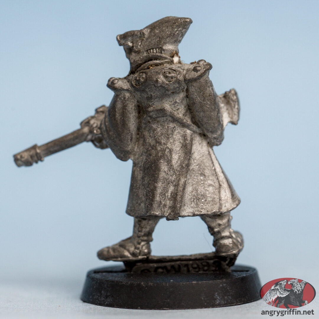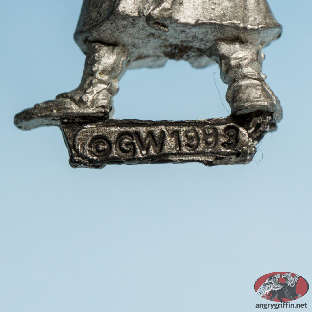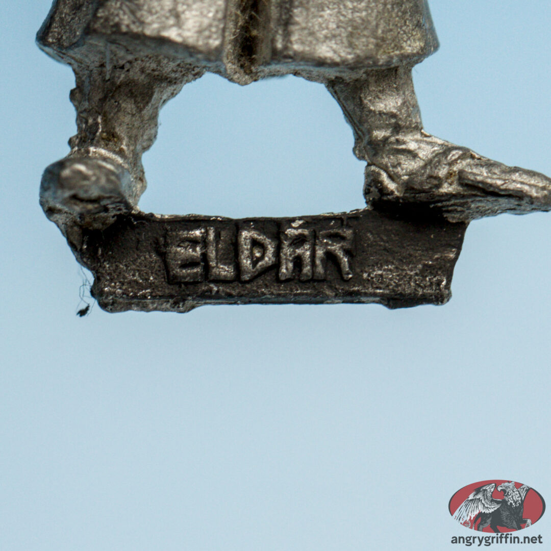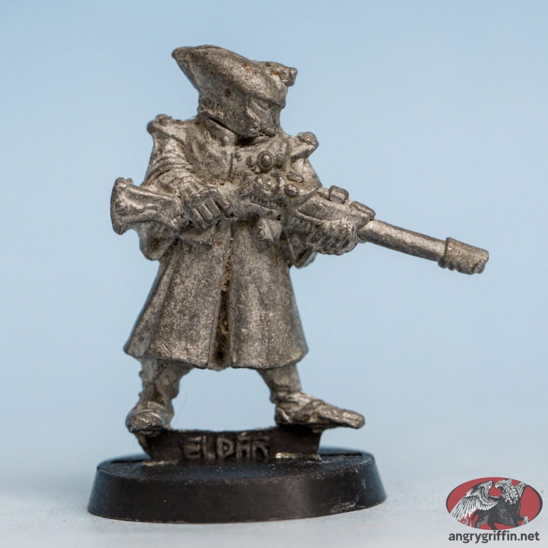 This is an Eldar Scout miniature for the Rogue Trader era of Warhammer 40K. It’s a Jes Goodwin sculpt from 1988 and was part number 430706 originally, then “Las Gun 3 071584/14” in the 1991 catalogue, then by the later catalogues it was “Eldar Scout with Needle Sniper Rifle 5 071527/14”.