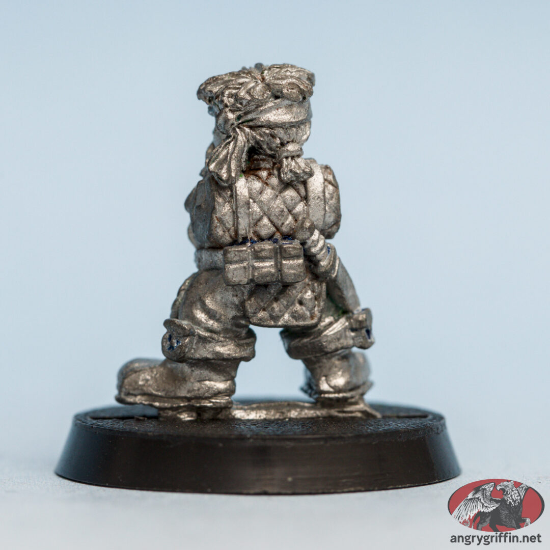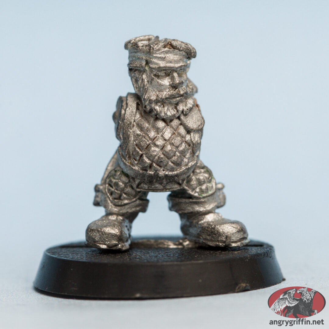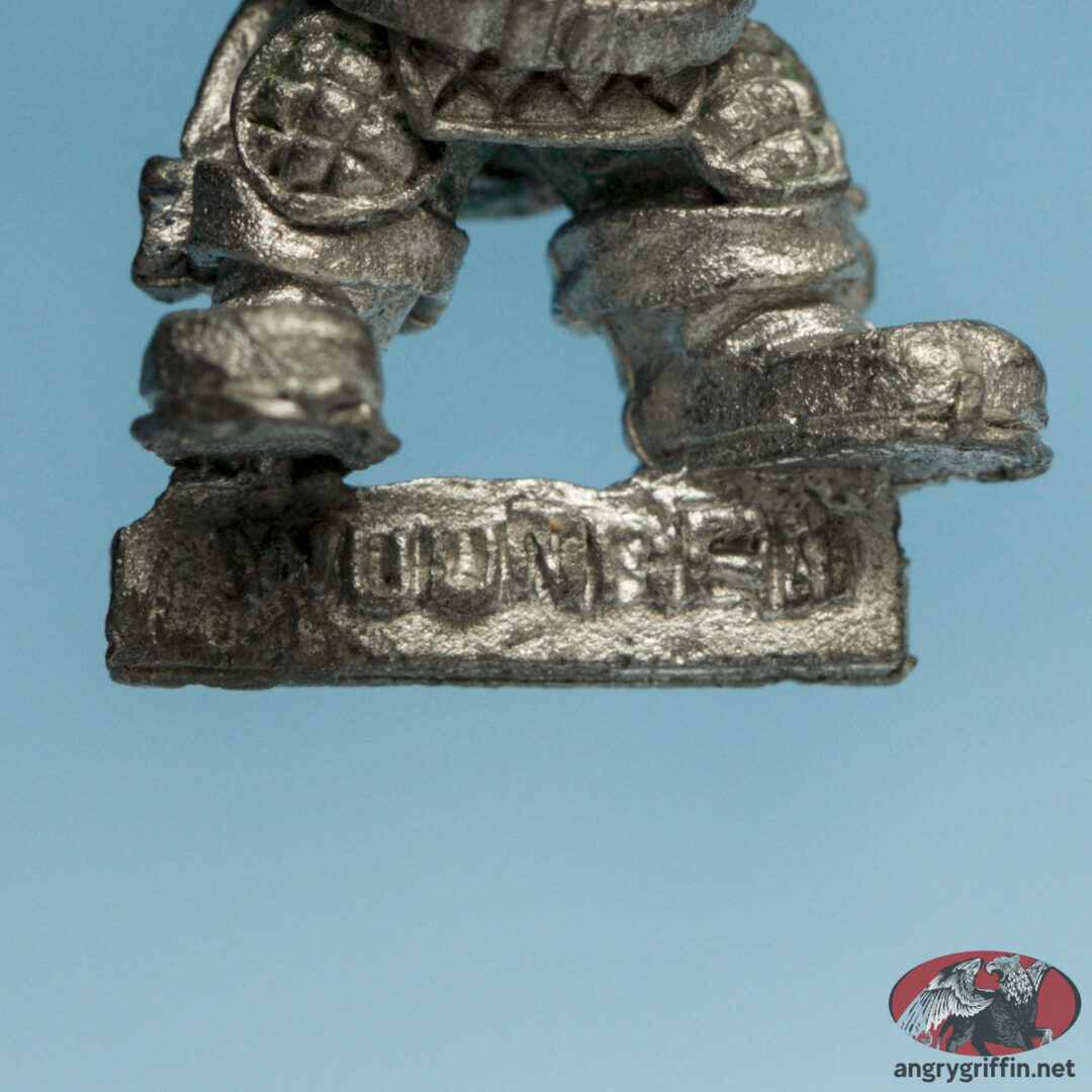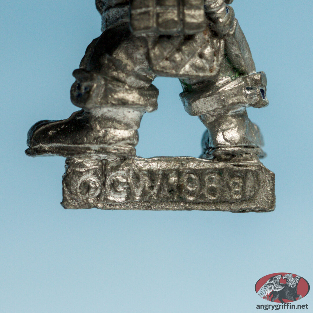 This metal Rogue Trader-era Warhammer 40K Squat has “WOUNDED” on the front of his tab but is in the early flyers as “Warrior 420409”. It’s a sculpt by either Michael or Alan Perry, and has 1988 on the base.