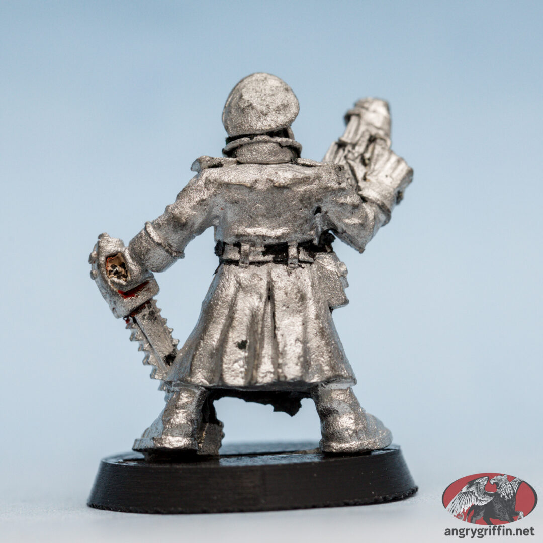 This metal Warhammer 40K Imperial Guard Commissar is a 1988 Mark Copplestone sculpt, part number 401003 and later 072117/4.