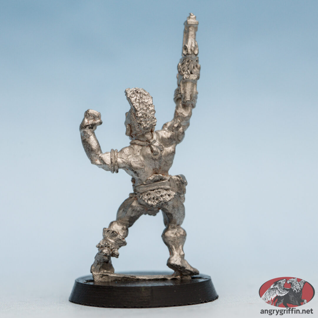This metal Rogue Trader-era Space Pirate was part of the RT601 Adventurers and Pirates range. He’s a 1988 sculpt by Trish Carden.